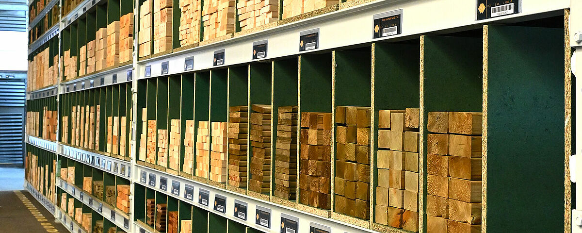 Afin d’obtenir une surface de stockage continue, OHRA monta des panneaux agglomérés en guise de fond dans les niveaux de stockage. Il sont séparés par des panneaux agglomérés d'une épaisseur de 18 millimètres que Brentjens a lui-même monté. Cela engendre des compartiments de largeurs différentes, dans lesquels les liteaux et lattes se laissent glisser facilement dans le sens longitudinal. Chaque compartiment est rempli avec un seul type d'article - le client détecte ainsi directement les diverses coupes transversales et peut accéder rapidement à la marchandise souhaitée. Le côté supérieur du rayonnage est par ailleurs exploité « classiquement » comme rayonnage à palettes ou rayonnage à tablettes et offre une surface de stockage supplémentaire pour les matériaux les plus divers.
