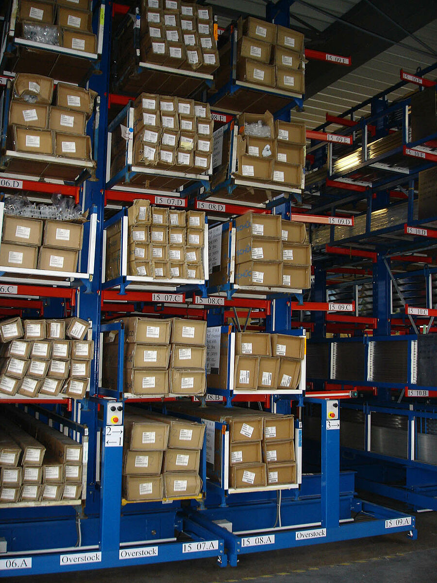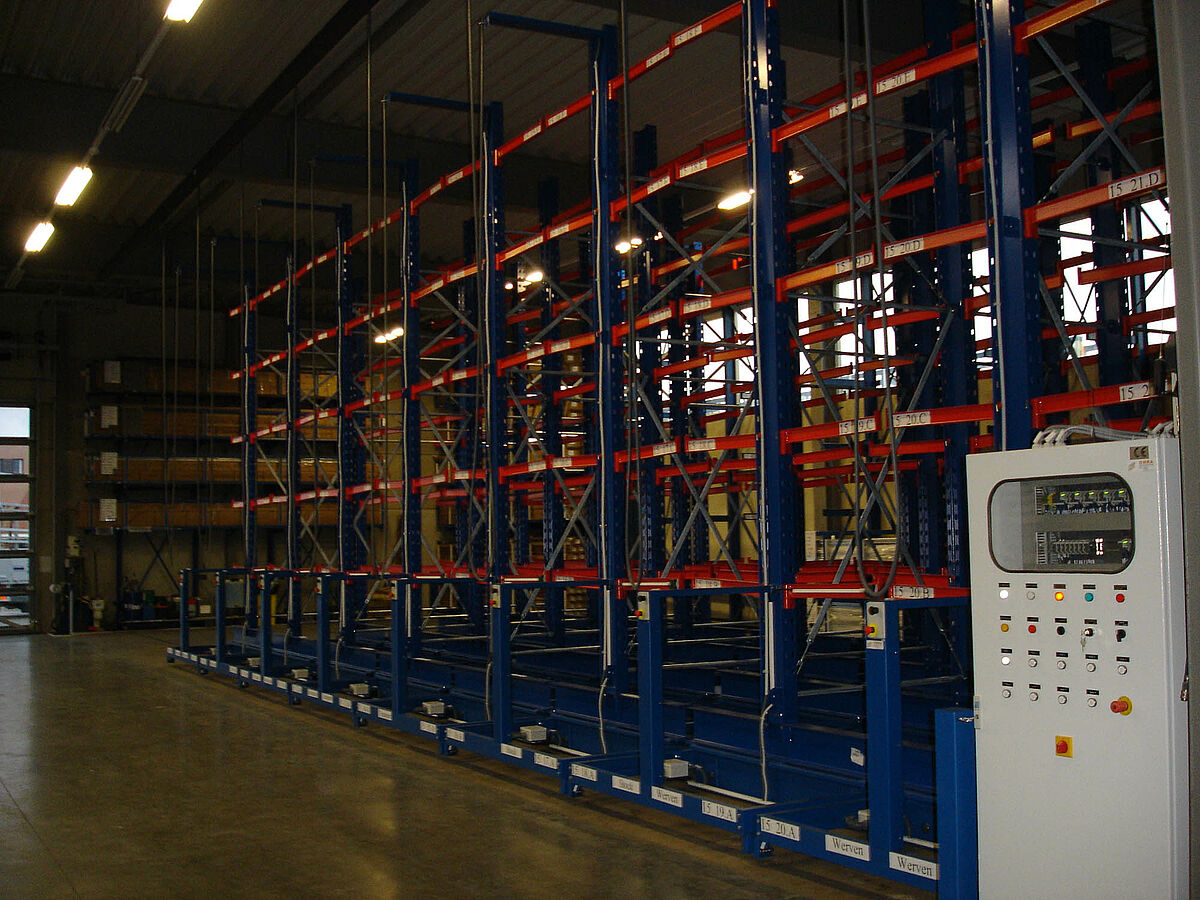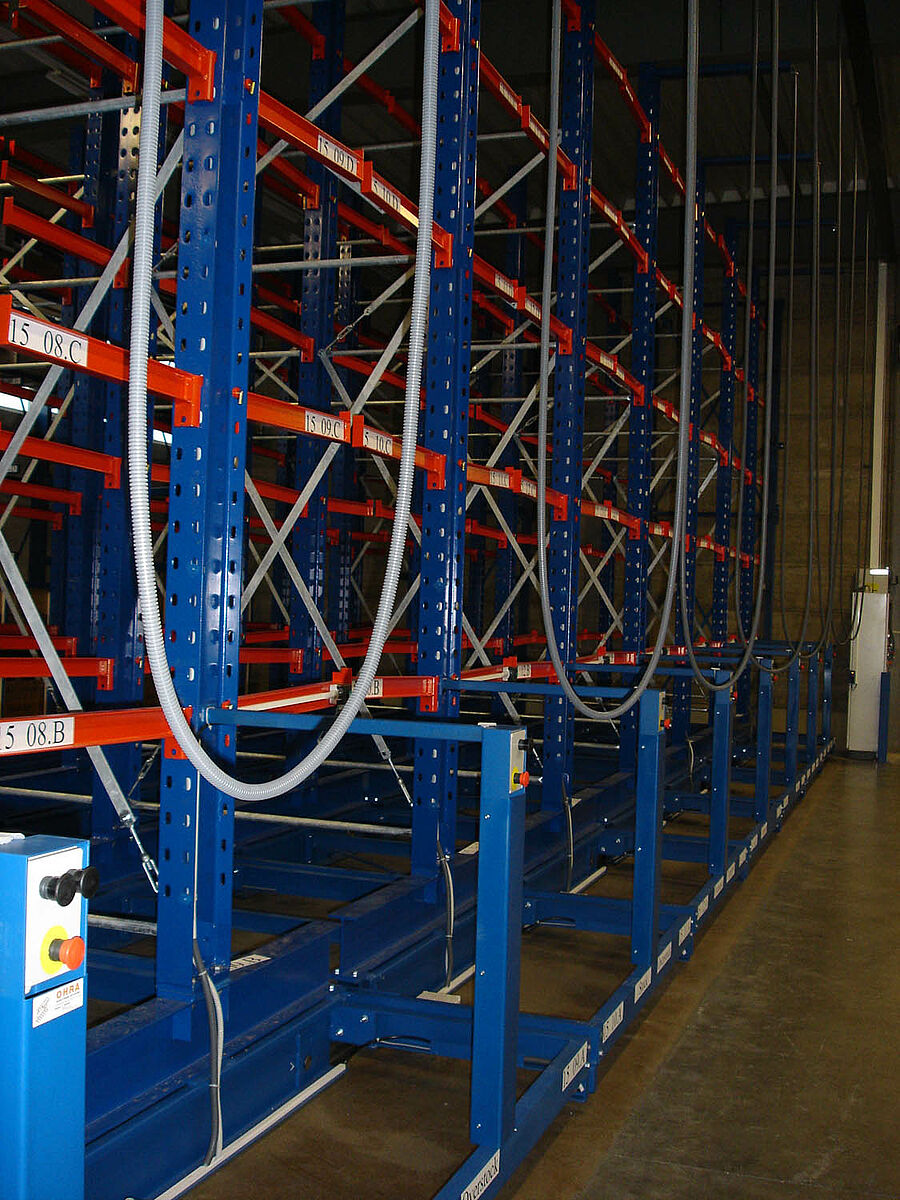 Diverses possibilités d’entreposage rationnel des produits ont été étudiées au cours de la discussion menée avec le client. Les rayonnages en porte-à-faux sur chariots transversaux sont apparus comme la meilleure solution. Ce système permet de créer un volume important de stockage sur une surface au sol très réduite. Les allées situées entre les différentes lignes de rayonnage ont été conçues de telle manière que les rayonnages au mur situés sur le côté de l’installation puissent être desservis de manière frontale. Cela n’aurait pas été possible avec des rayonnages statiques.