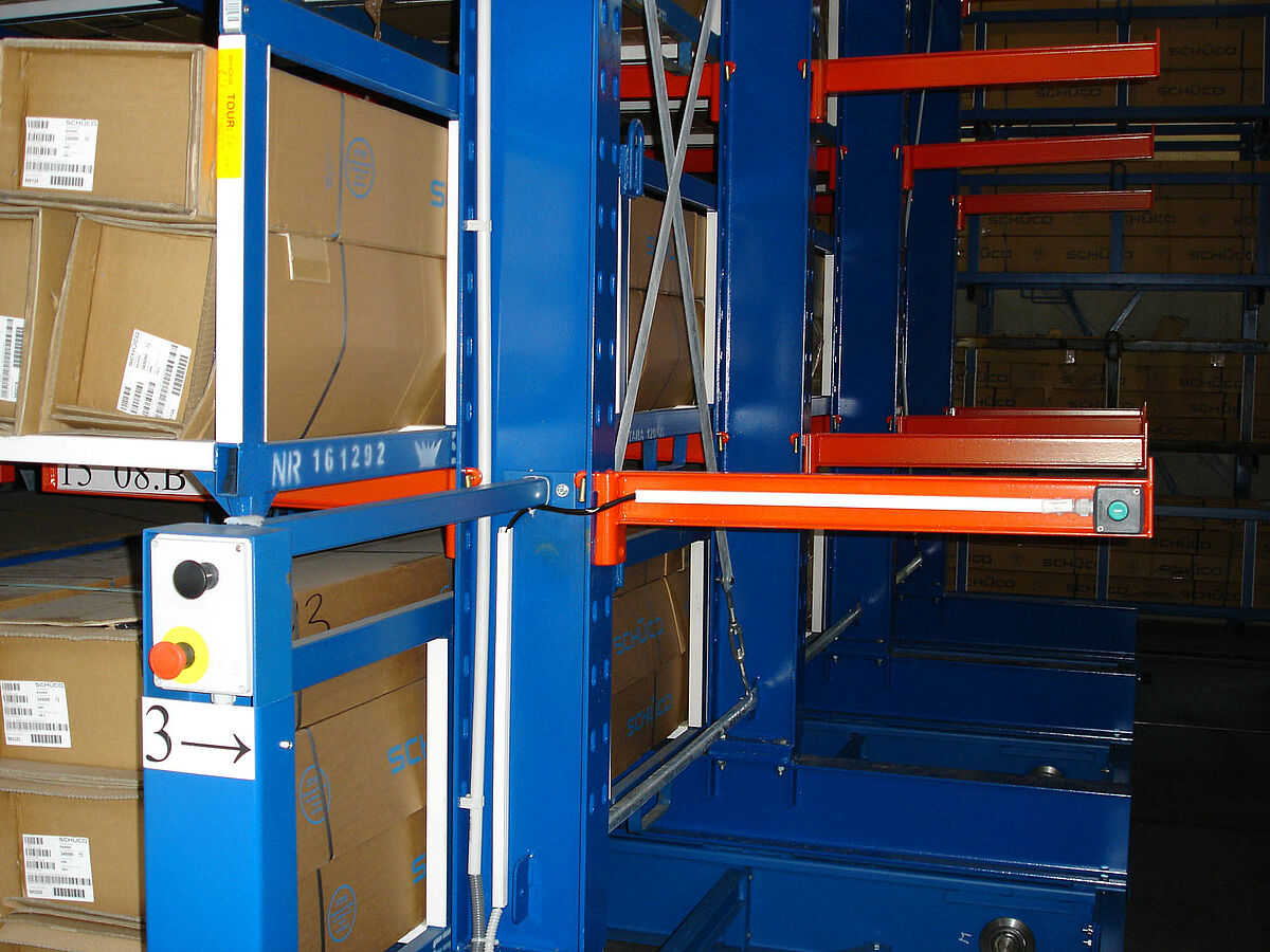 Ce client utilise pour la fabrication de ses différents produits des profilés aluminium de plus de six mètres de long, entreposés dans des cassettes SCHÜCO en aluminium. Le poids de chaque cassette est d’environ 1 600 kg et leur transport s’effectue au moyen d’un chariot élévateur à quatre sens de marche.
