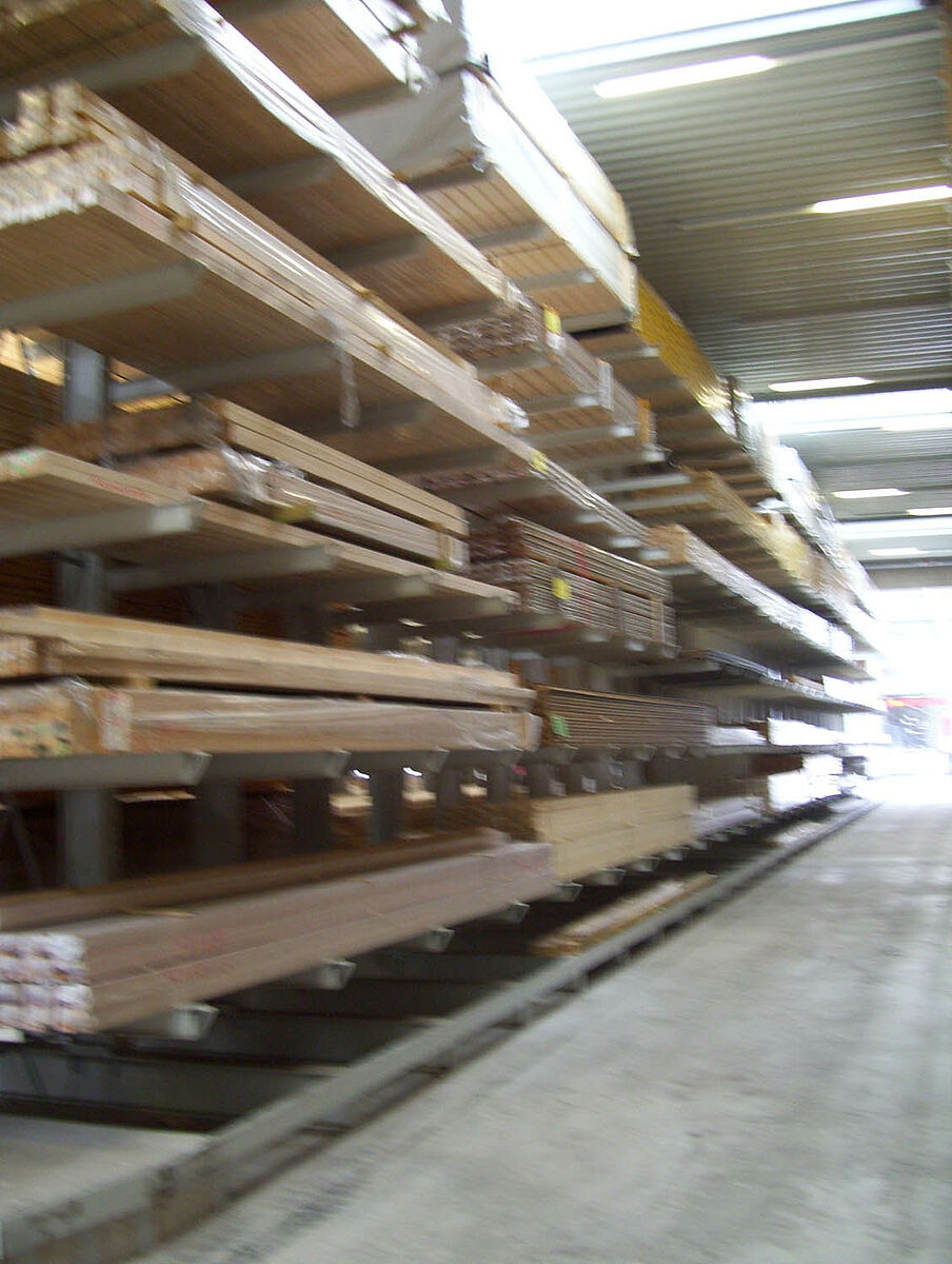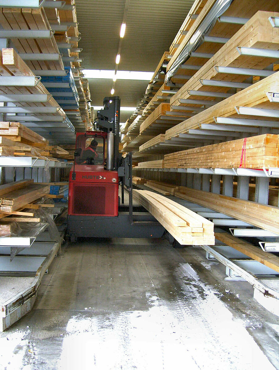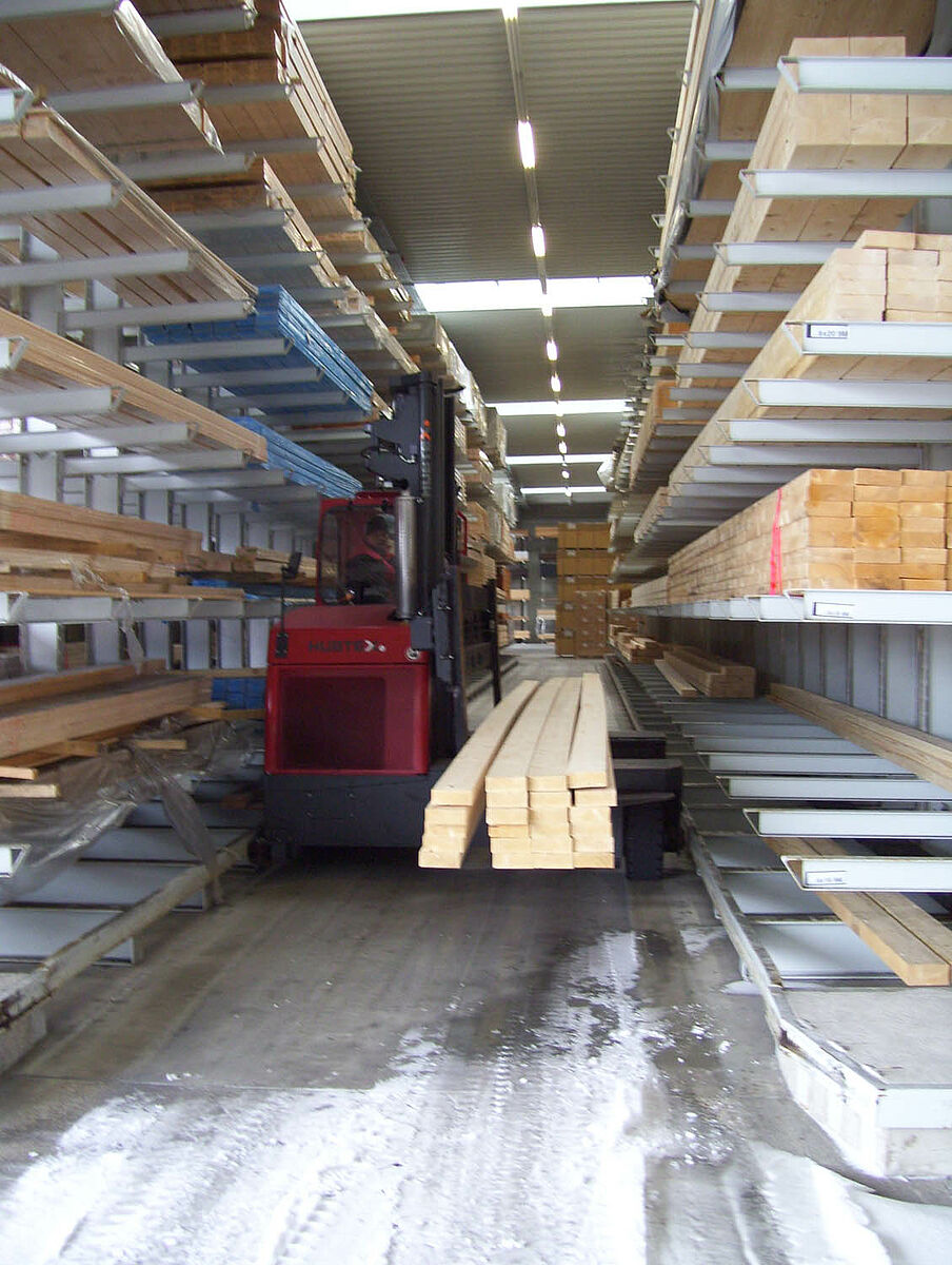 En deux semaines seulement, les experts de Kerpen montèrent alors 236 emplacements d'entreposage pour bois de construction massifs et bois stratifiés dans des rangées de rayonnages à bras portants de 40 et 50 mètres de longueur et 6,2 mètres de haut. Il se créa ainsi, au total, 2 800 mètres linéaires de niveaux de stockage pour bois en longueur. Parallèlement, 300 emplacements intégrés dans des rayonnages pour palettes et à bras portants, sur lesquels sont entreposés les matériaux en palettes et l'assortiment de base, virent le jour. L'exploitation de l'entrepôt fait appel à deux chargeurs latéraux Hubtex et à un chariot élévateur frontal Linde. Au cours des six premiers mois après la mise en service, ce ne sont pas moins de quelque 3 300 mètres cubes de bois qui changèrent de place.