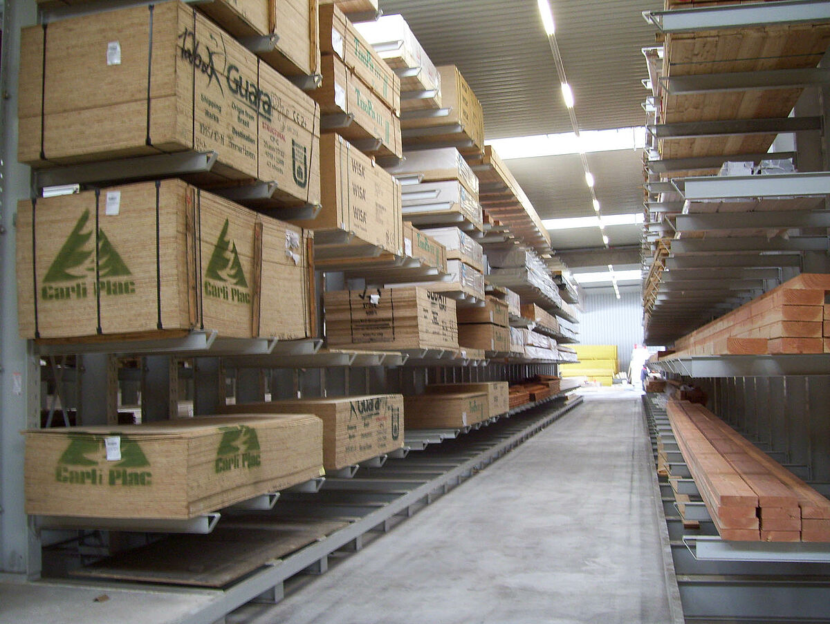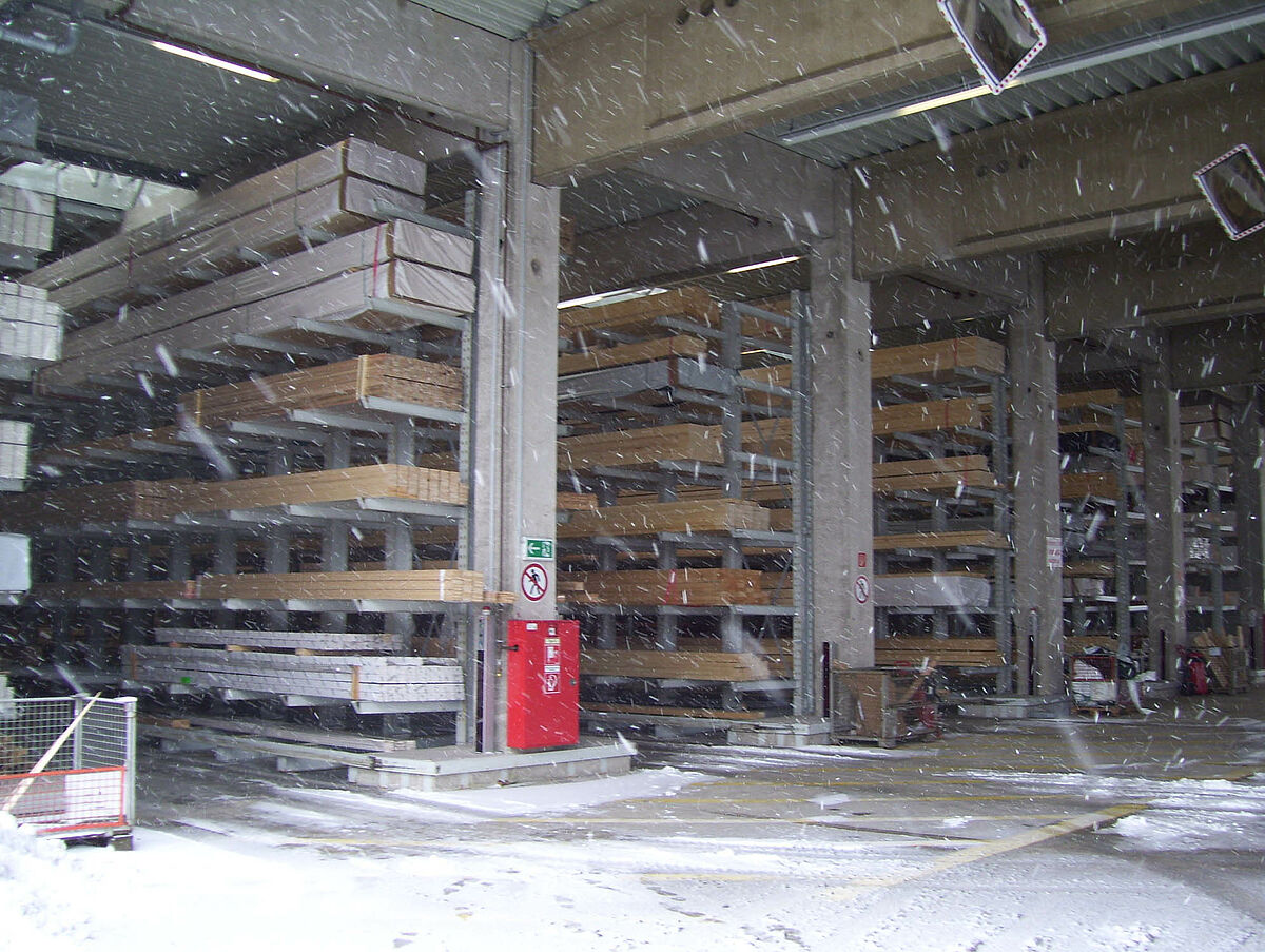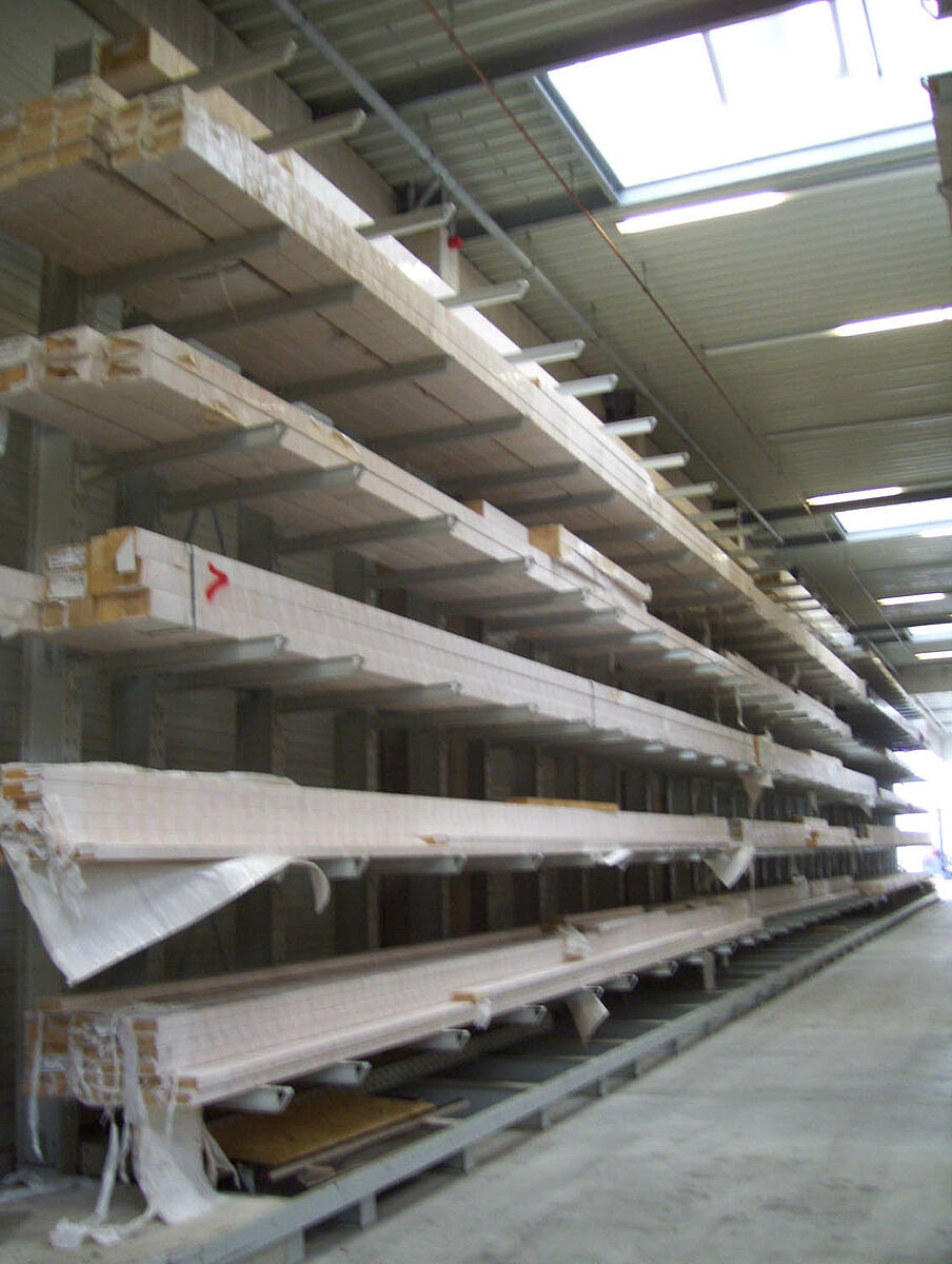 En deux semaines seulement, les experts de Kerpen montèrent alors 236 emplacements d'entreposage pour bois de construction massifs et bois stratifiés dans des rangées de rayonnages à bras portants de 40 et 50 mètres de longueur et 6,2 mètres de haut. Il se créa ainsi, au total, 2 800 mètres linéaires de niveaux de stockage pour bois en longueur. Parallèlement, 300 emplacements intégrés dans des rayonnages pour palettes et à bras portants, sur lesquels sont entreposés les matériaux en palettes et l'assortiment de base, virent le jour. L'exploitation de l'entrepôt fait appel à deux chargeurs latéraux Hubtex et à un chariot élévateur frontal Linde. Au cours des six premiers mois après la mise en service, ce ne sont pas moins de quelque 3 300 mètres cubes de bois qui changèrent de place.