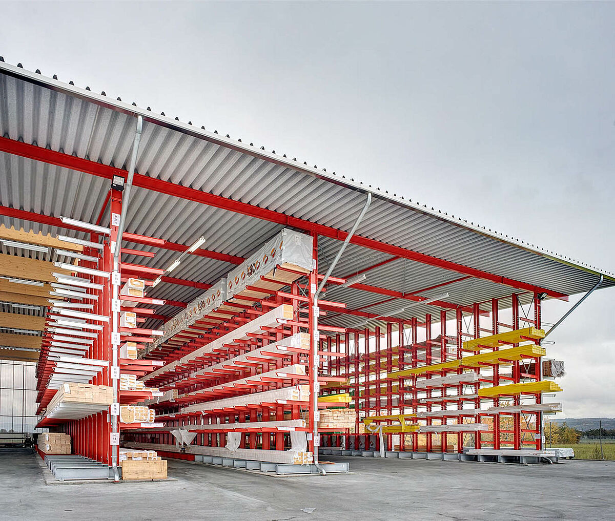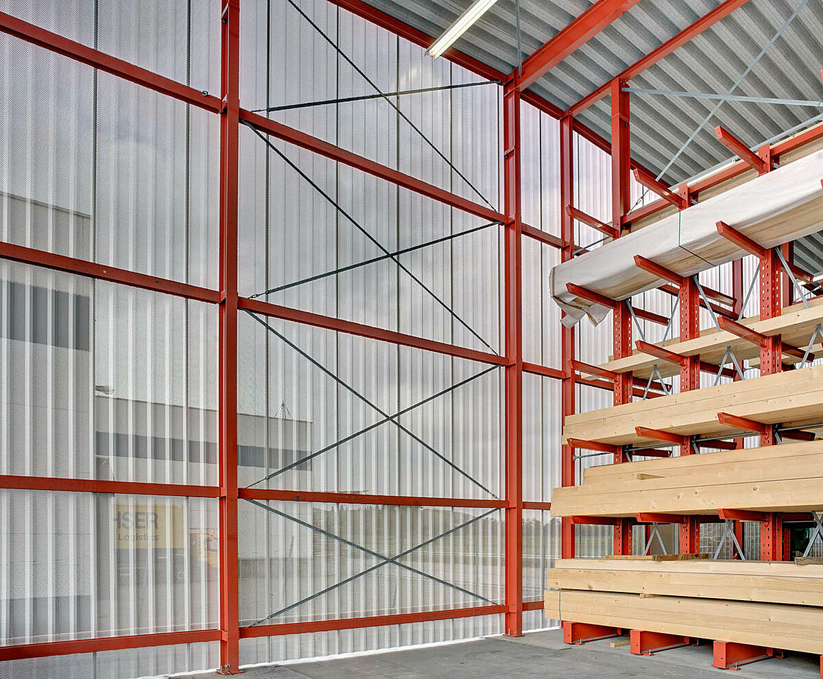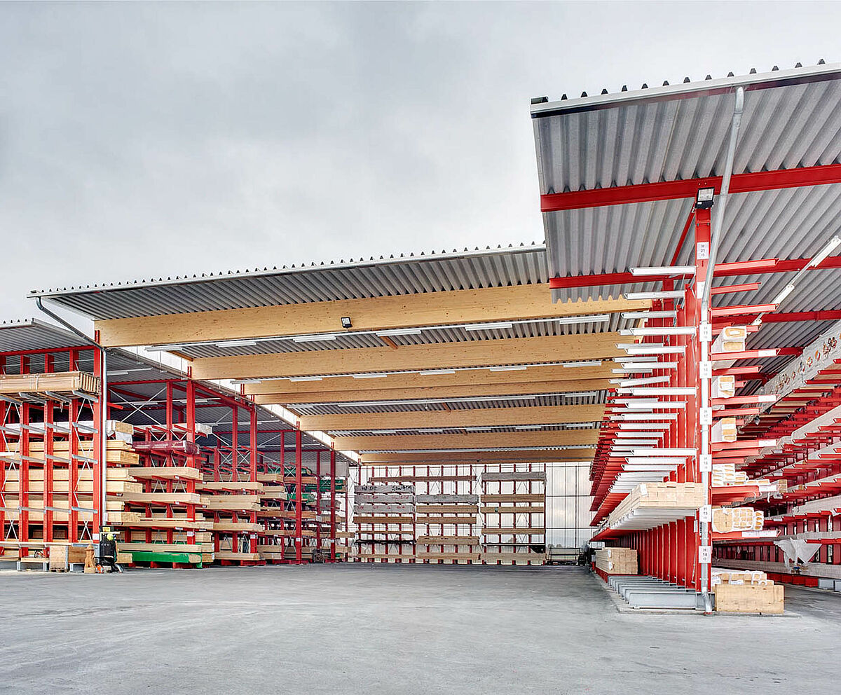 Déjà dans la planification du projet, il s’avère que l’utilisation de rayonnages cantilever avec construction de toiture est la meilleure solution et la plus économique. En tout, 250 tonnes d’acier pour les rayonnages et la toiture sont donc fabriqués, livrés et montés.