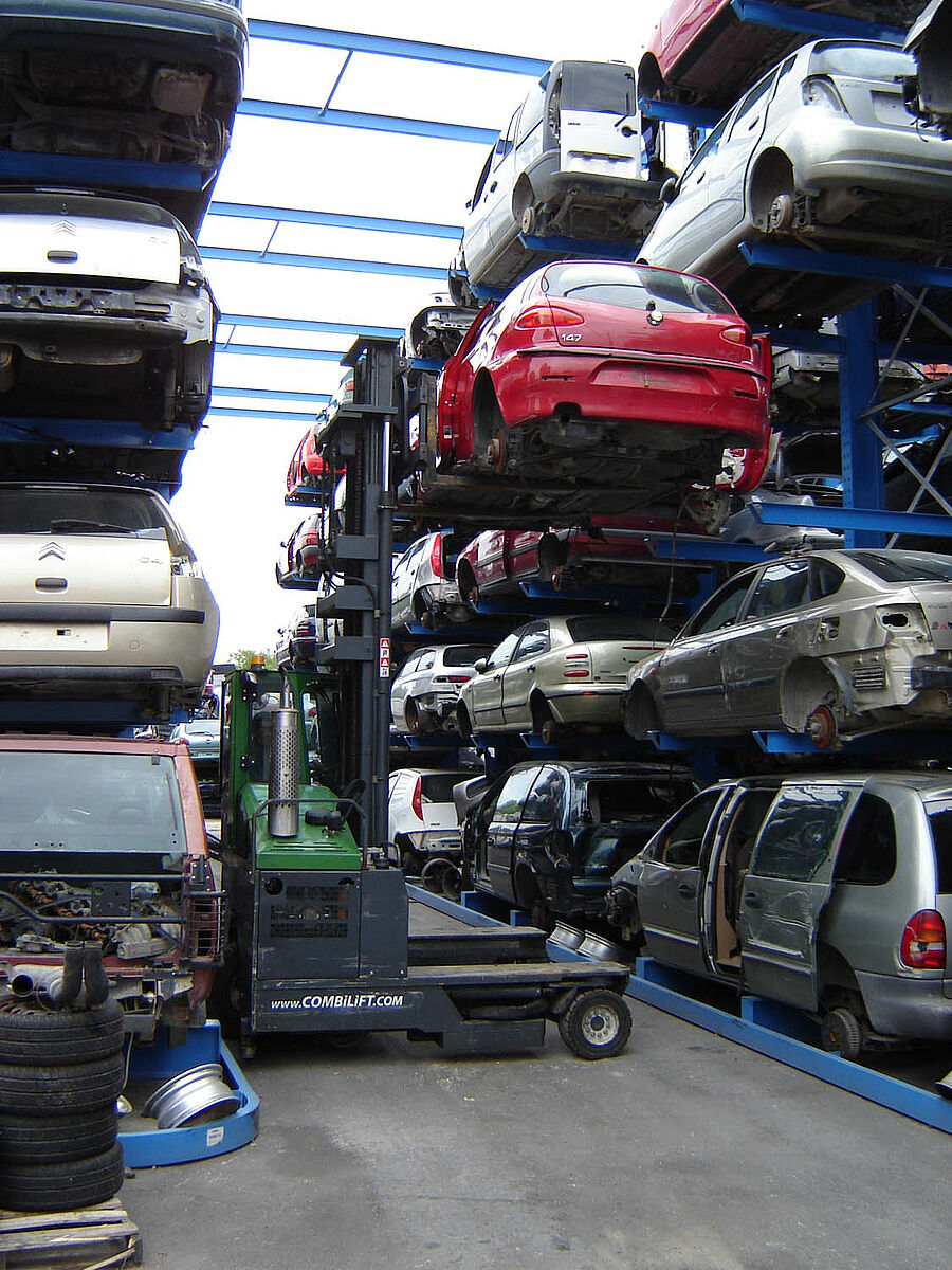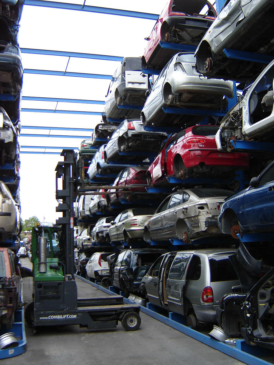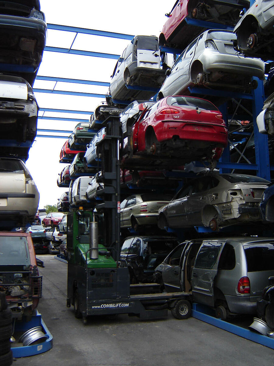 Grâce aux systèmes de rayonnage, chaque véhicule est placé, dès son arrivée dans le centre de recyclage, à un endroit précis qui lui est réservé sur la durée. Ainsi, tous les éléments restent intègres. Si la base de données contient une portière de type « A », il ne fait alors nul doute que celle-ci pourra être récupérée dans un parfait état. L’environnement est ainsi respecté, au même titre que le taux légalement prescrit pour le recyclage et la récupération des véhicules usagés. Pour les entreprises, ceci se traduit également par des répercussions extrêmement positives sur le plan économique. Les pertes en raison de pièces endommagées ou égarées n’ont en effet plus raison d’être.