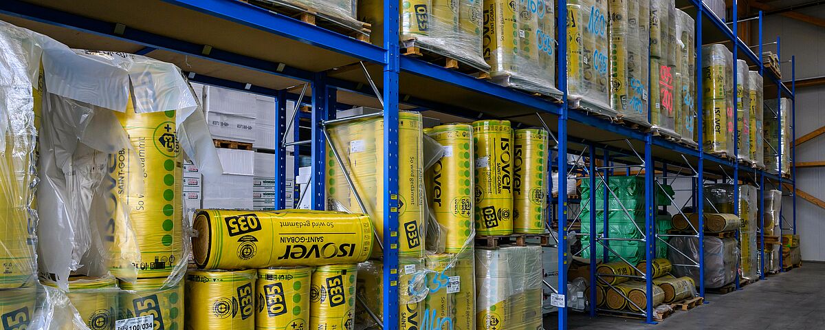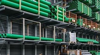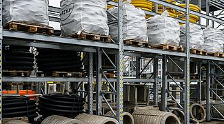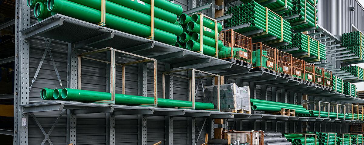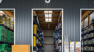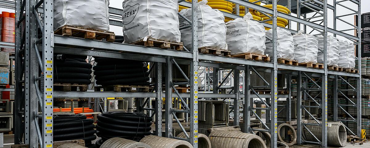En raison de la diversité des matériaux, OHRA a équipé les zones de stockage de rayonnages cantilever et de rayonnages à palettes. Au total, 22 rayonnages, simple et double profondeur, d'une hauteur allant jusqu'à 7.500 millimètres, ont été installés. Chaque rayonnage est configuré individuellement pour les différentes marchandises en termes de capacité de charge, de nombre de niveaux de stockage et d'accessoires. Alors que les rayonnages intérieurs ont été peints dans la couleur souhaitée, les rayonnages extérieurs sont galvanisés et donc protégés contre les intempéries. Certains rayonnages ont été équipés de montants d'appui ou de caillebotis afin d'être le plus flexible possible pour le stockage d'articles de différentes dimensions. Le rayonnage final du hall est également particulier : Il a été conçu de manière à pouvoir accueillir des palplanches entre les montants de la structure, il constitue ainsi le mur arrière du bâtiment.