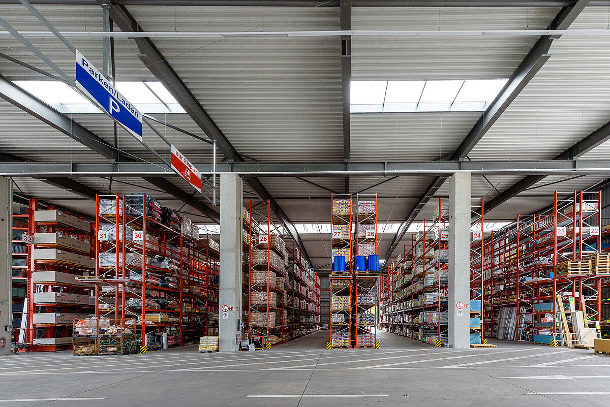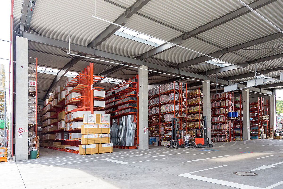 En 2016, Götz + Moriz a décidé d'agrandir et de moderniser le centre de construction existant de Lörrach, le deuxième plus grand site sur les huit sites de l'entreprise. Il a fallu dégager plus de place par souci d'une plus grande diversité d'articles, d'un meilleur service pour les clients et d'une chaîne logistique plus efficace. Jusqu'alors, les marchandises étaient souvent stockées au sol, en blocs ou sur des plateformes. Les rayonnages existants étaient plutôt bas et offraient des capacités de levage très limitées.