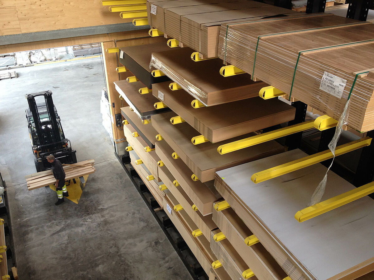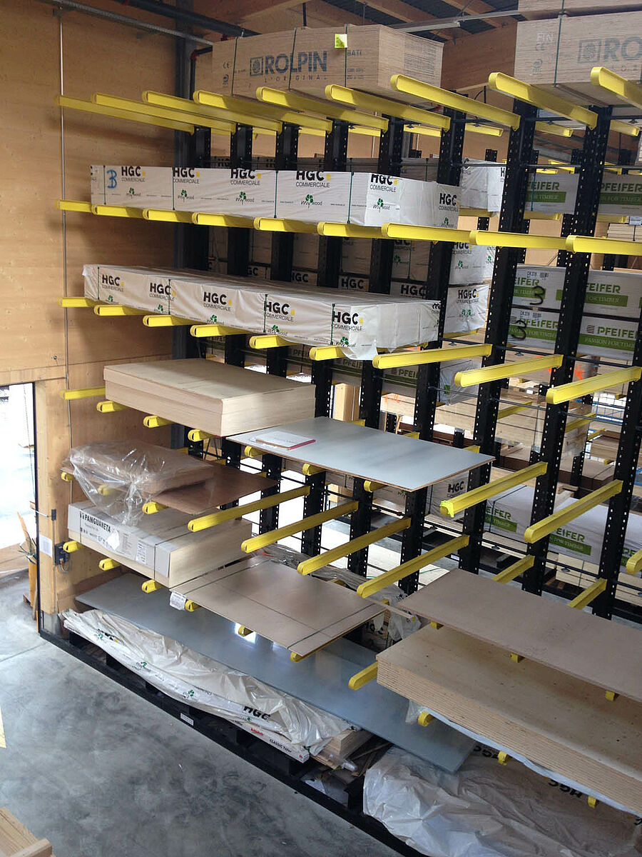De par leurs dimensions, charges utiles et équipements complémentaires, les rayonnages d'ORHA sont non seulement parfaitement adaptés aux produits vendus par HGC, mais en outre, ont été habillés aux couleurs de l'entreprise : Les poutres et les cadres ont été peints en noir (RAL 9017), les rayons et les bras portants en jaune (RAL 1018). Ainsi, l'identité de l'entreprise de négoce se manifeste de façon indéniable jusqu'à l'intérieur de l'entrepôt où les clients viennent enlever leurs marchandises.