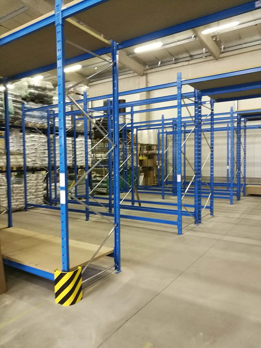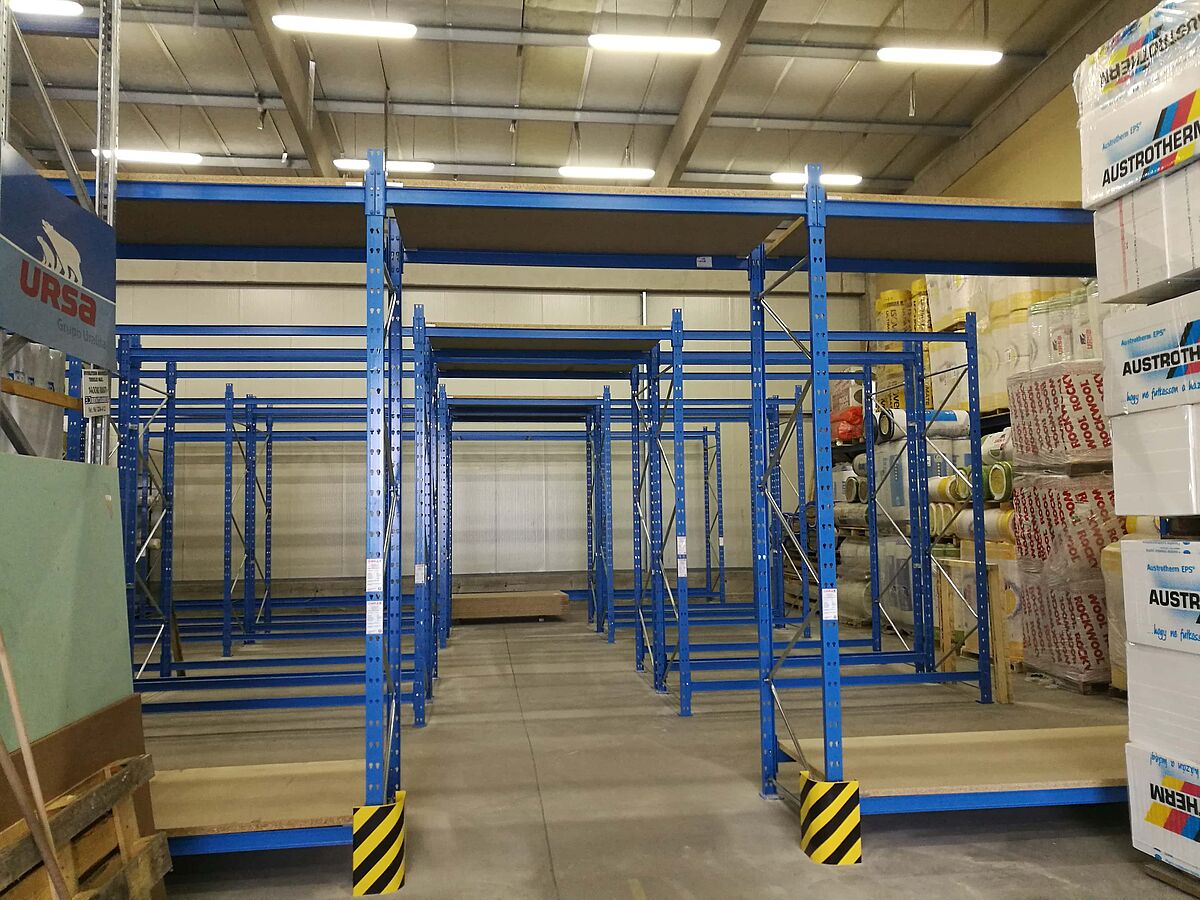 Avec les rayonnages à palettes adaptés individuellement d'OHRA, un deuxième niveau de stockage a pu être créé : Cinq rangées d'étagères d'une longueur de 10,6 à 12 mètres et d'une hauteur de support de 3580 millimètres, soit presque la même hauteur que les étagères, offrent de la place pour des matériaux isolants tels que la laine de roche et la laine de verre. Grâce aux étagères, le volume de rangement peut maintenant être utilisé presque jusqu'au plafond du hall. Des passages de 2,2 mètres de large permettent un accès rapide à toutes les étagères. Trois rangées supplémentaires de rayonnages à palettes offrent un espace supplémentaire pour les marchandises palettisées.