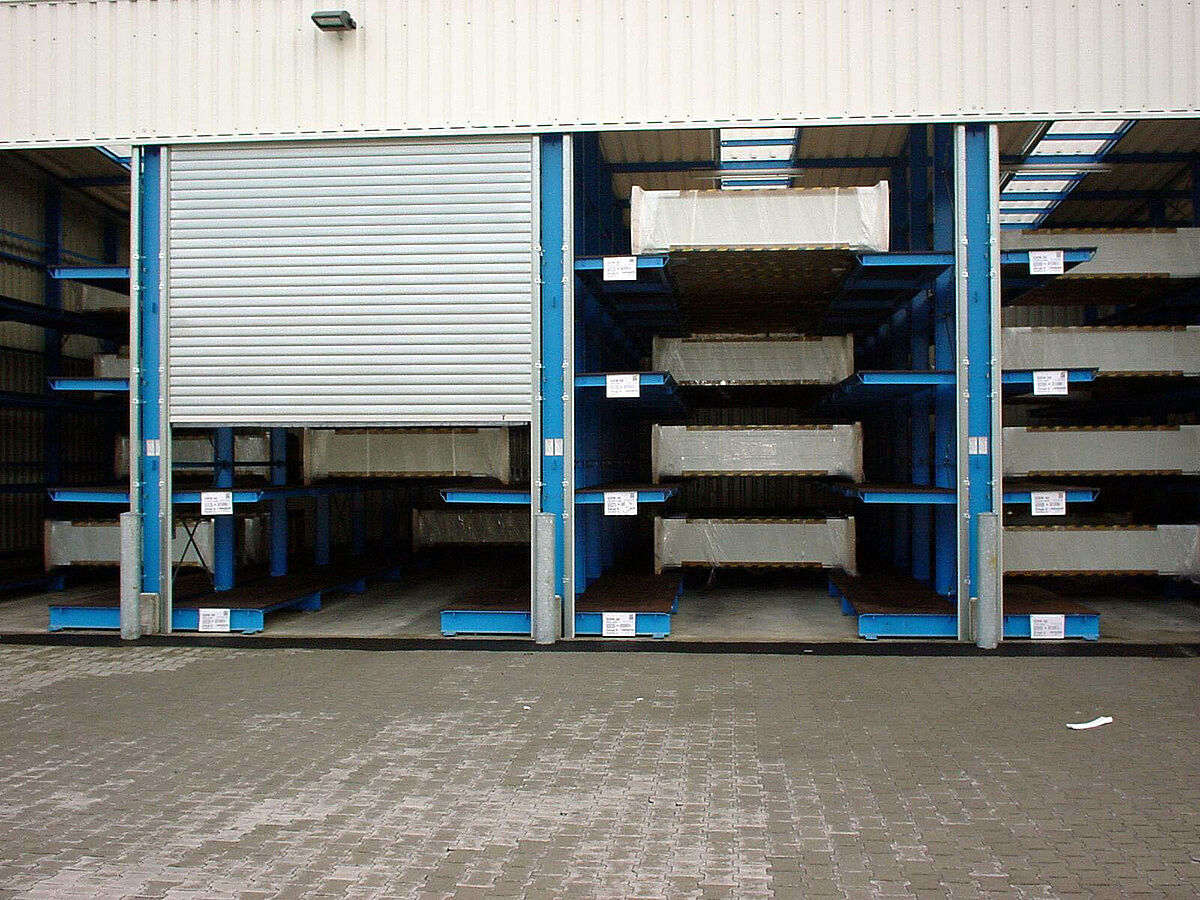 En raison d’un grand succès commercial, une extension de l’entrepôt des produits finis s’avère nécessaire, il faudra par ailleurs tenir compte des conditions particulières exigées par le stockage de séries limitées. Après une série d‘entretiens pour la planification, un nouvel ensemble de rayonnages drive-in a été conçu sur la base de rayonnages à bras portants, qui permet de stocker des portails d’une largeur de 4,2 m à 6,5 m.