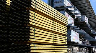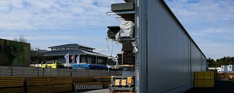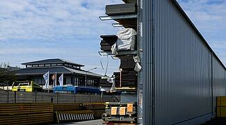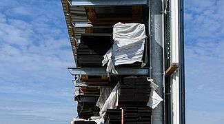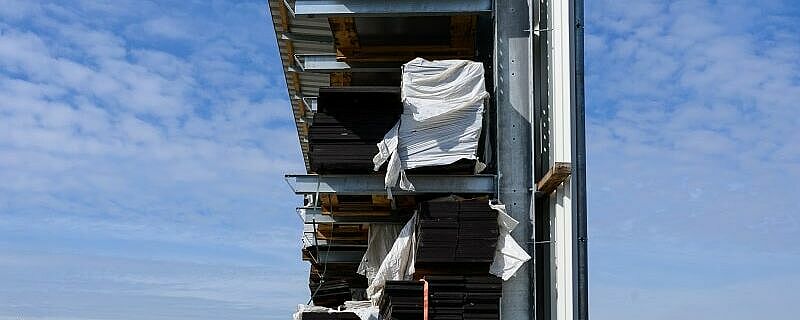 Un toit intégré de deux mètres de profondeur ainsi que la partie arrière recouverte de tôles de bardages protègent les panneaux de contreplaqué stockés des intempéries. L'un des défis était que les panneaux mesurent entre 3,3 par 2,4 et 0,6 par 0,3 mètres. Pour éviter que les panneaux ne fléchissent pendant le stockage, OHRA a adapté l'espacement entre les montants et l'a fait varier à l'intérieur du rayonnage : Entre 26 montants, il est de 1.000 millimètres, entre les 27 autres de 1.200 millimètres. Ainsi, tous les formats peuvent être stockés en toute sécurité et l'espace est bien exploité.