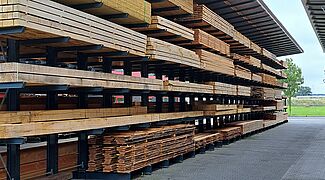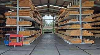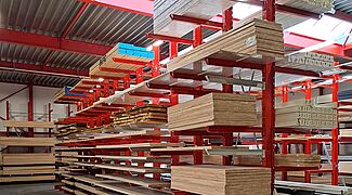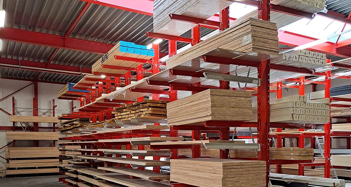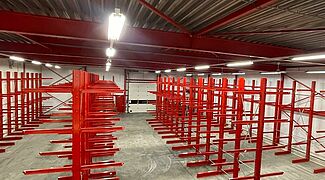 En raison des bonnes expériences que van Deuveren avait déjà faites avec les rayonnages OHRA, le nouveau siège de l'entreprise a également été équipé de systèmes de rayonnage du leader européen du marché des rayonnages cantilever. OHRA fabrique les montants des rayonnages et les cantilevers en profilés d'acier IPE laminés à chaud à parois pleines, ce qui signifie que les rayonnages cantilever restent durablement stables, même lorsqu'ils sont utilisés à pleine capacité, et qu'ils assurent un haut niveau de sécurité pour le personnel et les clients. Les rayonnages sont en principe fabriqués individuellement par OHRA en fonction des besoins du client - chez van Deuveren, cela s'appliquait non seulement aux dimensions et aux charges, mais aussi à la couleur.