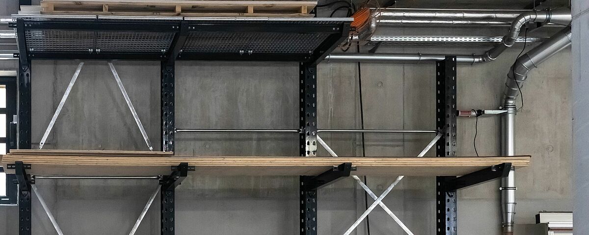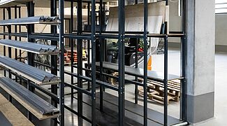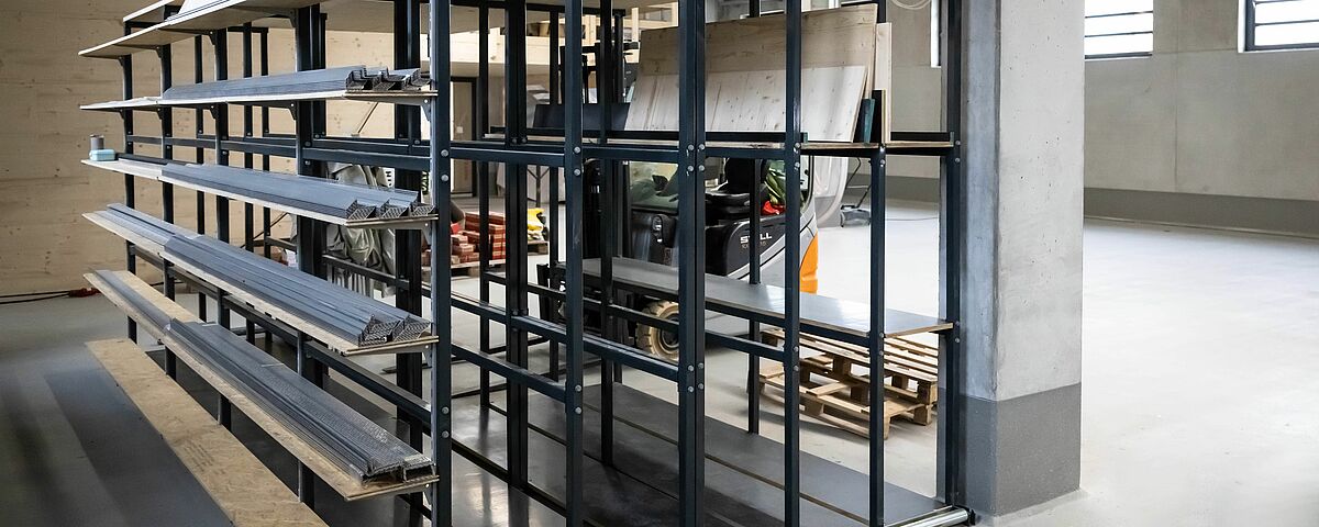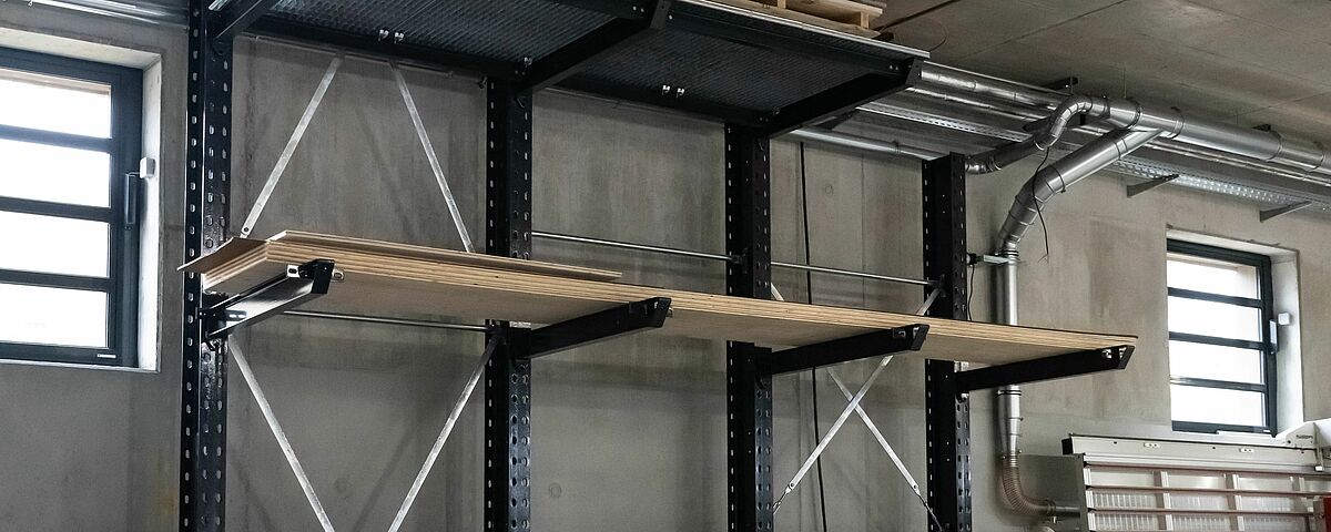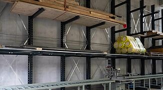 L'installation de rayonnage conçue pour le nouveau stock se compose d'un rayonnage cantilever galvanisé à chaud de près de 16 mètres de long pour l'extérieur. Un rayonnage cantilever de 15 mètres de long et un autre de trois mètres ont été montés à l'intérieur. Les rayonnages cantilever d'une hauteur d'environ sept mètres offrent une capacité de stockage nettement plus importante que le stockage au sol et que les rayonnages cantilever nettement plus bas utilisés sur l'ancien site. Les cantilevers des rayonnages, qui peuvent supporter jusqu'à 1 000 kilogrammes, ont en outre été partiellement équipés de tablettes grillagées et de ponts à bras. Ainsi, des bois, des produits en attente et des formats de palettes très différents peuvent être rangés dans les rayonnages. De plus, grâce aux cantilevers, les hauteurs des différents niveaux de stockage peuvent être réglées de manière très flexible. Pour le stockage de panneaux de différentes tailles, deux étagères verticales supplémentaires ont été construites, dans lesquelles les panneaux sont stockés verticalement - il est ainsi possible d'accéder rapidement et simplement au panneau souhaité. Sur demande, toutes les étagères intérieures ont été laquées par « Ihre Zimmerei » dans une couleur gris anthracite (RAL 7016) très attrayante.