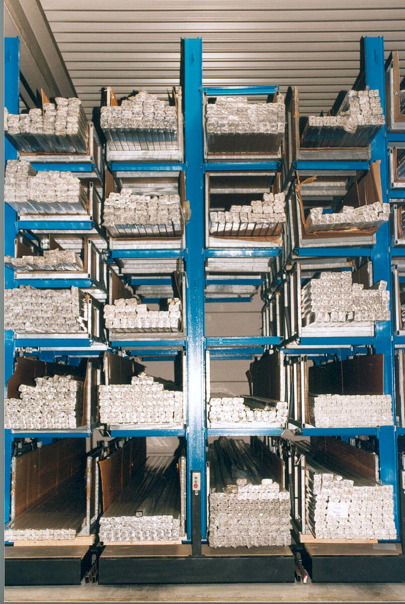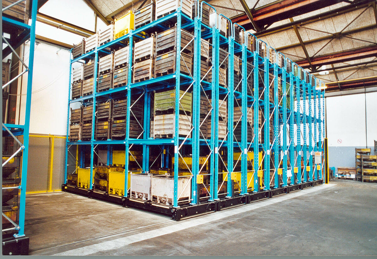 Ensembles de rayonnages conventionnels montés sur des chariots mobiles sur roues. Pour l'entrée et la sortie des marchandises, une allée à l'emplacement désiré est ouverte par commande électronique.