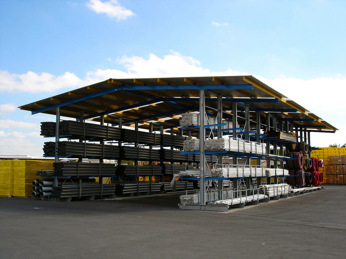 Rayonnages cantilevers sont idéales pour stocker des éléments longues, volumineux et lourds, tels comme bois, Placoplatre, béton, ferraillage ou profilés en acier. Les systèmes de stockage sont robustes et constitués de profilés acier normalisés laminés à chaud. Ils n’ont pas de montants intermédiaires gênants et sont de ce fait adaptés au stockage de marchandises de dimensions et variétés différentes sur un même niveau de stockage. Les bras portants, mobiles et réglables en hauteur, s'écartent en cas de choc vers le haut ou le côté, évitant ainsi tout dommage à la marchandise et au rayonnage. Bras portants installés à l'horizontale (système K + H). Les rayonnages à bras portants OHRA sont produits de façon individuelle et peuvent être montés à l'intérieur comme à l'extérieur, sur demande avec toiture et mur.