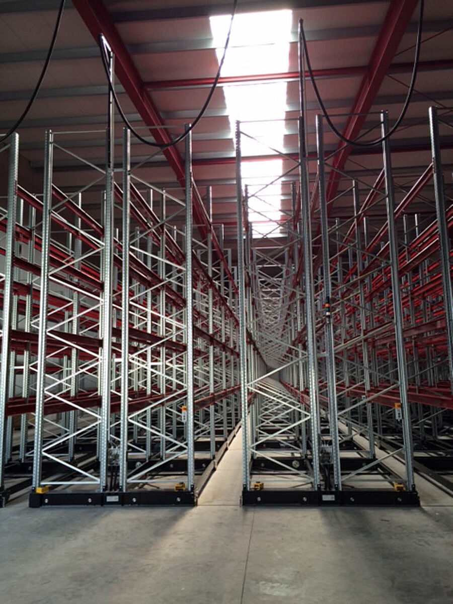 Les rayonnages à palettes mobiles sont des systèmes dynamiques appropriés pour le stockage compact des marchandises palettisées sur une surface au sol réduite. Les robustes rayonnages à palettes de ce système de stockage sont montés sur des bases mobiles résistantes aux déformations. La ligne de rayonnage complète se déplace comme une seule unité au moyen d’une commande électronique ou manuelle. Les bases mobiles se déplacent sur des rails qui peuvent être installés au moment de la construction de l’entrepôt ou bien dans un sol déjà existant. Ainsi, une seule allée est nécessaire pour accéder à tous les blocs du rayonnage à palettes. Cette solution permet de maximiser l'espace disponible, dégageant une seule allée à partir de laquelle s’effectuent l’entrée et la sortie des marchandises.