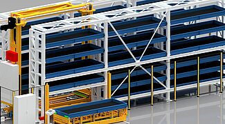 3. Le TowerMat TM-RE est la version la plus puissante et est conçu pour de grandes quantités de stockage, avec un transstockeur déplaçable latéralement le long de plusieurs tours de stockage.