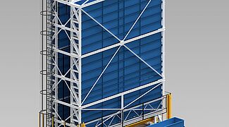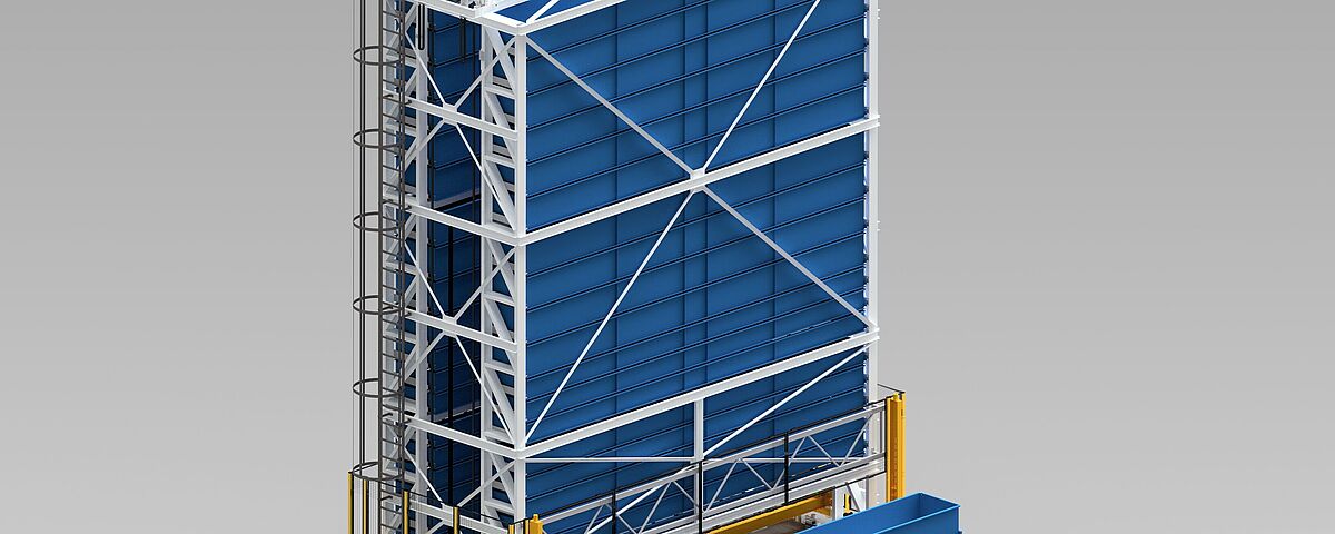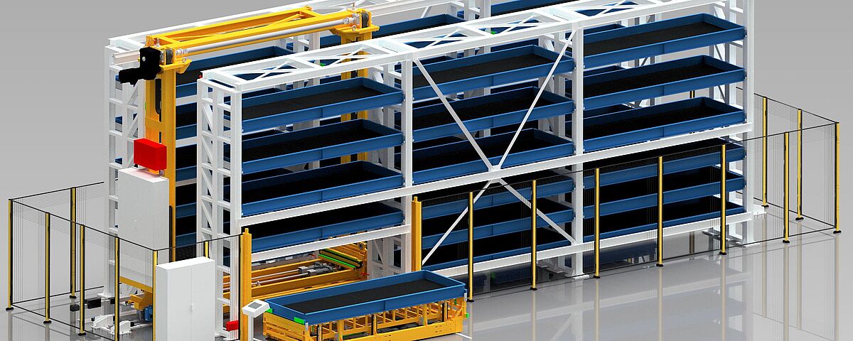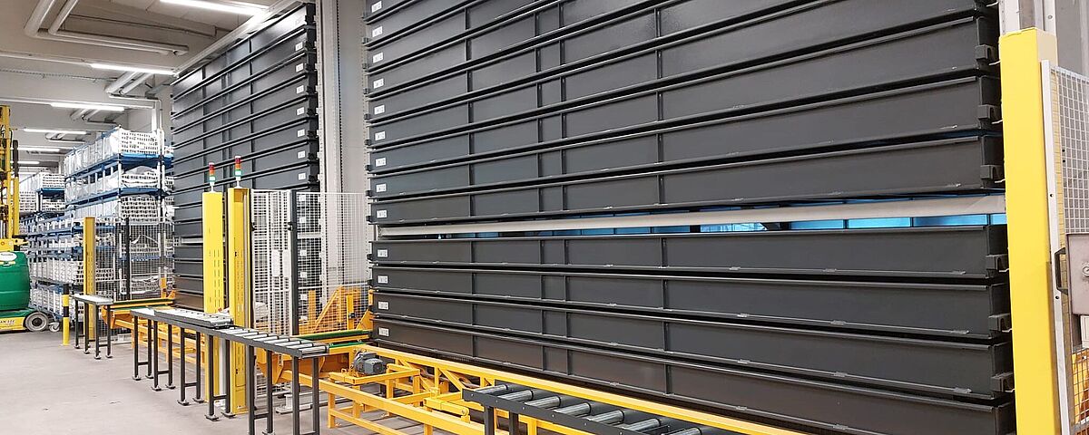 2. Le TowerMat TM-FE est conçu pour des capacités de stockage moyennes et permet une efficacité particulièrement élevée grâce à plusieurs tours de stockage et à un transstockeur central.