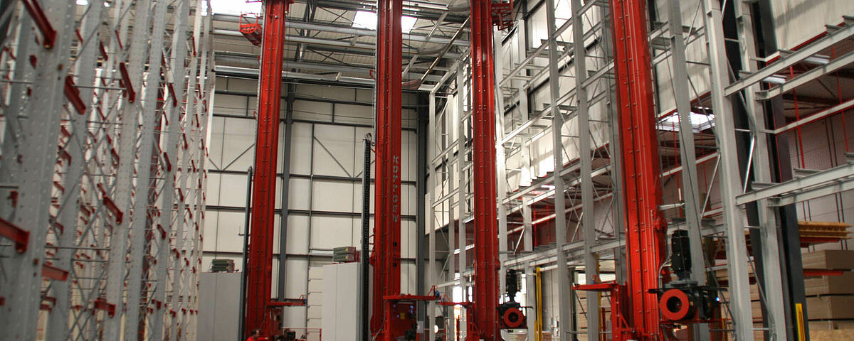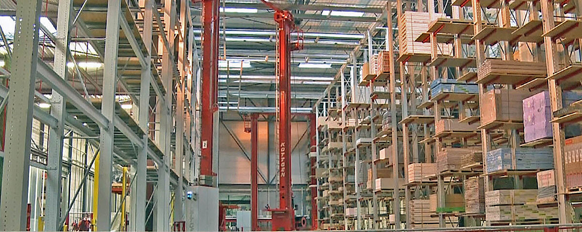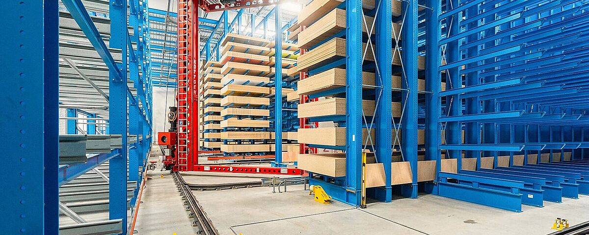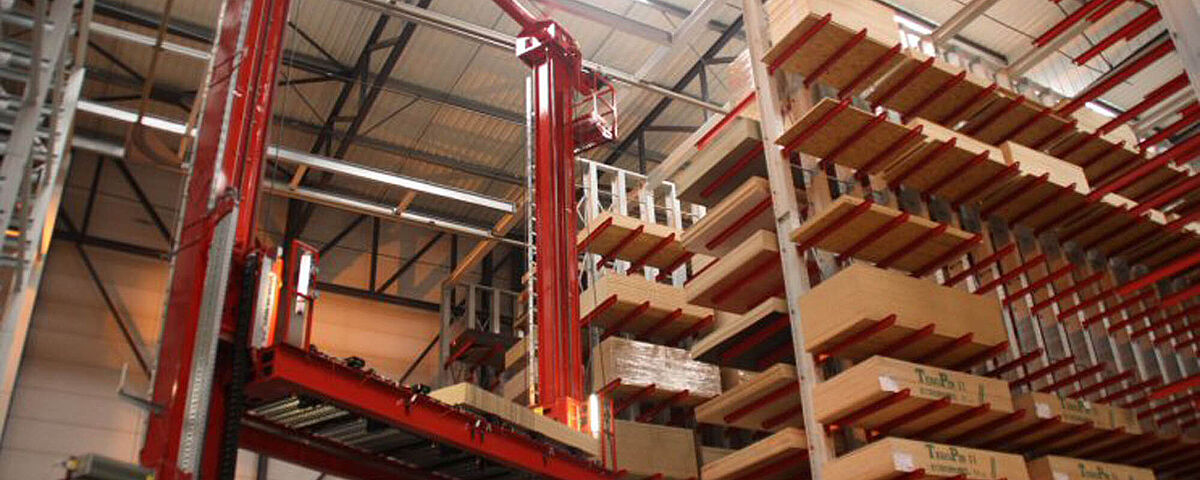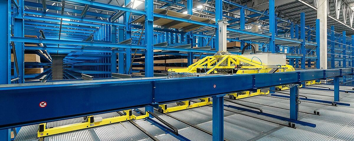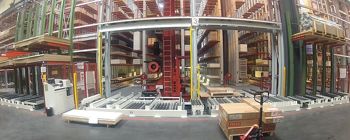 Le concept d'utiliser les avantages de la préparation de commandes en deux étapes est totalement nouveau : Le stockage et le déstockage des colis dans l'entrepôt sont assurés par un transstockeur (SRM). Si une commande d'expédition nécessite le prélèvement de différents panneaux individuels, un manipulateur pneumatique prépare les articles correspondants pour l'expédition, ce qui permet de traiter plusieurs commandes en parallèle.