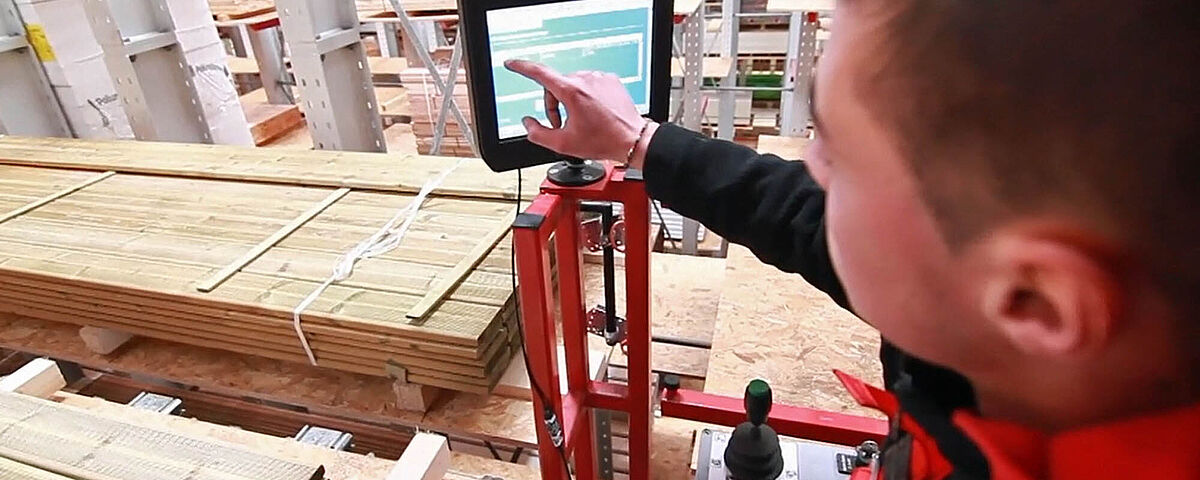 Le transstockeur se déplace automatiquement vers l'emplacement dans l’étagère, lequel est préalablement déterminé par l'opérateur. Le positionnement exact devant l'emplacement se fait de façon entièrement automatique, tandis que les processus de manutention des panneaux de bois, par exemple, sont régulés par l'opérateur via une commande manuelle. Cela comprend le levage et l'abaissement des charges, y compris l’orientation des fourches.